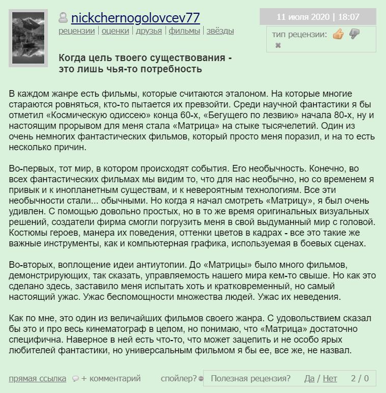Ведь, если все мы будем придерживаться одного единственного мнения, то тогда чем мы тогда будем отличаться от героев «Матрицы», слепо следующих правилам компьютерной программы?